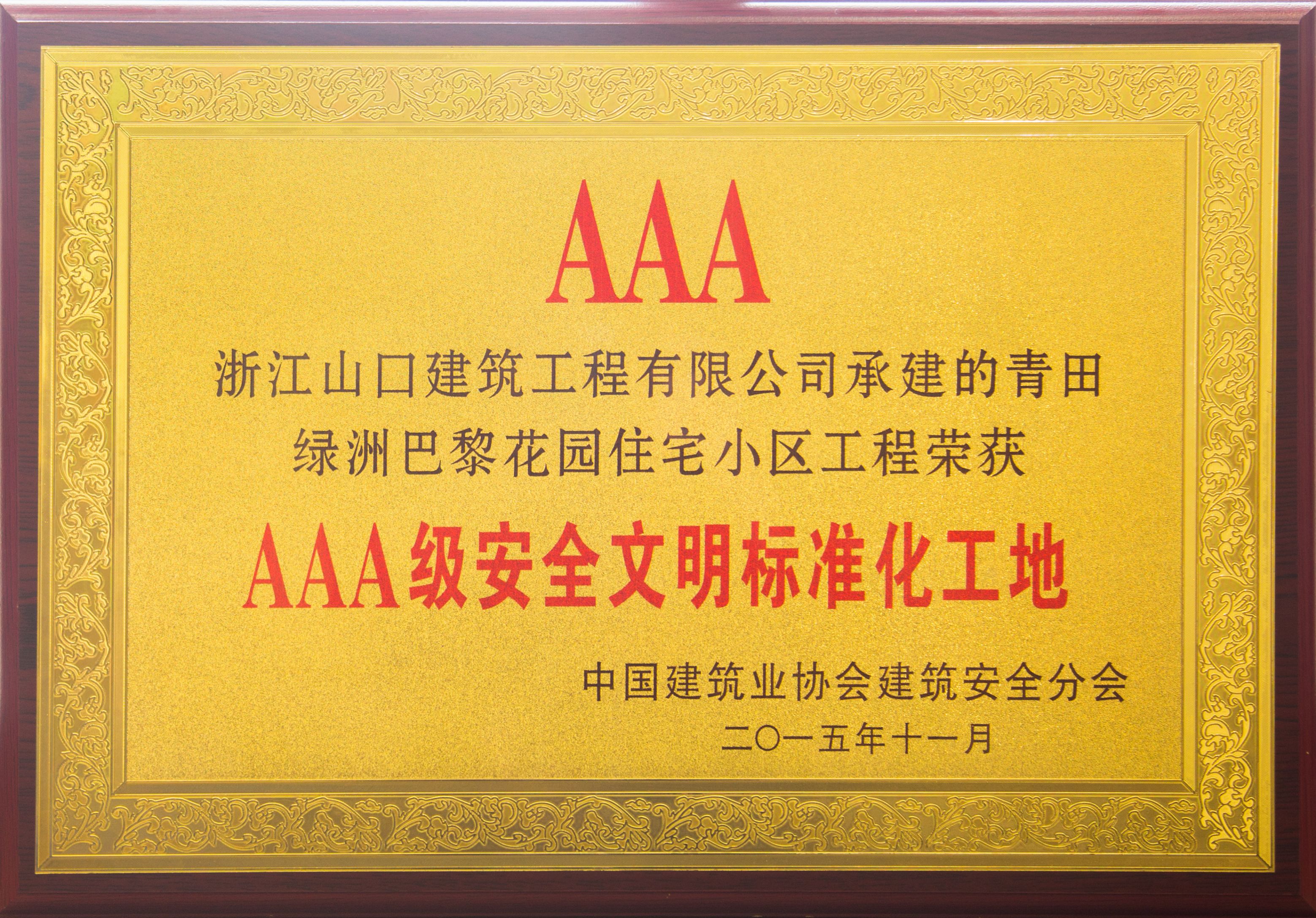 2015年青田绿洲巴黎花园住在小区工程荣获全国建设工程项目AAA安全生产标准化工地